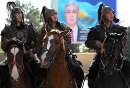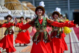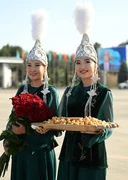 Ulusal kostümler giymiş kızlar, Kasım-Comart Tokaev'i karşılayarak ona çiçek, boorsok ve bal sundular.