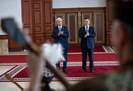 İki ülkenin bayrakları direklere asıldı, halı serildi, milli çadır şeklinde bir enstalasyon kuruldu ve bir tören kıtası oluşturuldu.