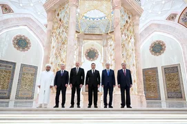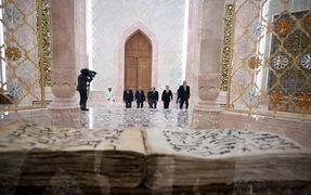 Azerbaycan, Kazakistan ve Tacikistan liderleriyle birlikte Cumhurbaşkanı Sadır Caparov, İslam dünyasının en eski ve en saygın el yazmalarından biri olan Osman Mushafı'nın bulunduğu Kur'an-ı Kerim Salonu'nu gezdi.